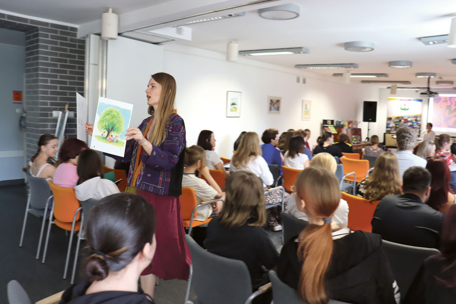 Uczestnicy spotkania dowiedzieli się, że jej ilustracje powstają głównie technikami tradycyjnymi – z papierowych skrawków i wycinanek, które dopiero na końcowym etapie są skanowane i poddawane delikatnej obróbce cyfrowej.