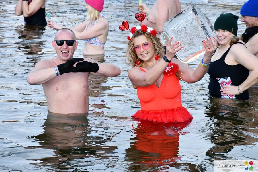 Nad zalew w Tuligłowach zjechało ponad 20 klubów morsa z województwa lubelskiego. Gości powitał Piotr Kociuba z Klub Morsów Krasnostawskie Karpie, który dodatkowo zaprosił wszystkich uczestników po zimnej kąpieli na saunę, jacuzzi, kuchnię polową, grilla z kiełbaskami i karkówką oraz wspólną zabawę przy muzyce. Podkreślił, że zlot to doskonała okazja do integracji i wspólnego spędzenia czasu. – Morsowanie ma pozytywny wpływ na samopoczucie, odporność i zdrowie. Korzystnie działa przy stanach zapalnych i reumatologicznych. Jak rozpocząć taką przygodę? Należy wziąć ręcznik, kąpielówki i przyjechać do nas na Tuligłowy, gdzie zapraszamy w każdą niedzielę. Trzeba też trochę silnej woli, bo to jest najważniejsze – mówi Kociuba. W organizację imprezy zaangażowało się miasto Krasnystaw. Daniel Miciuła, burmistrz Krasnegostawu, życzył wszystkim udanej zabawy i wyraził podziw dla uczestników, nie tylko za ich determinację, by wejść do lodowatej wody przy kilkustopniowym mrozie, ale także za kreatywne walentynkowo-karnawałowe przebrania oraz dekoracje. Podziękował też Andrzejowi Tarajko, który wyrzeźbił dwa karpie z olbrzymich brył lodu. (kg, fot. miasto Krasnystaw)